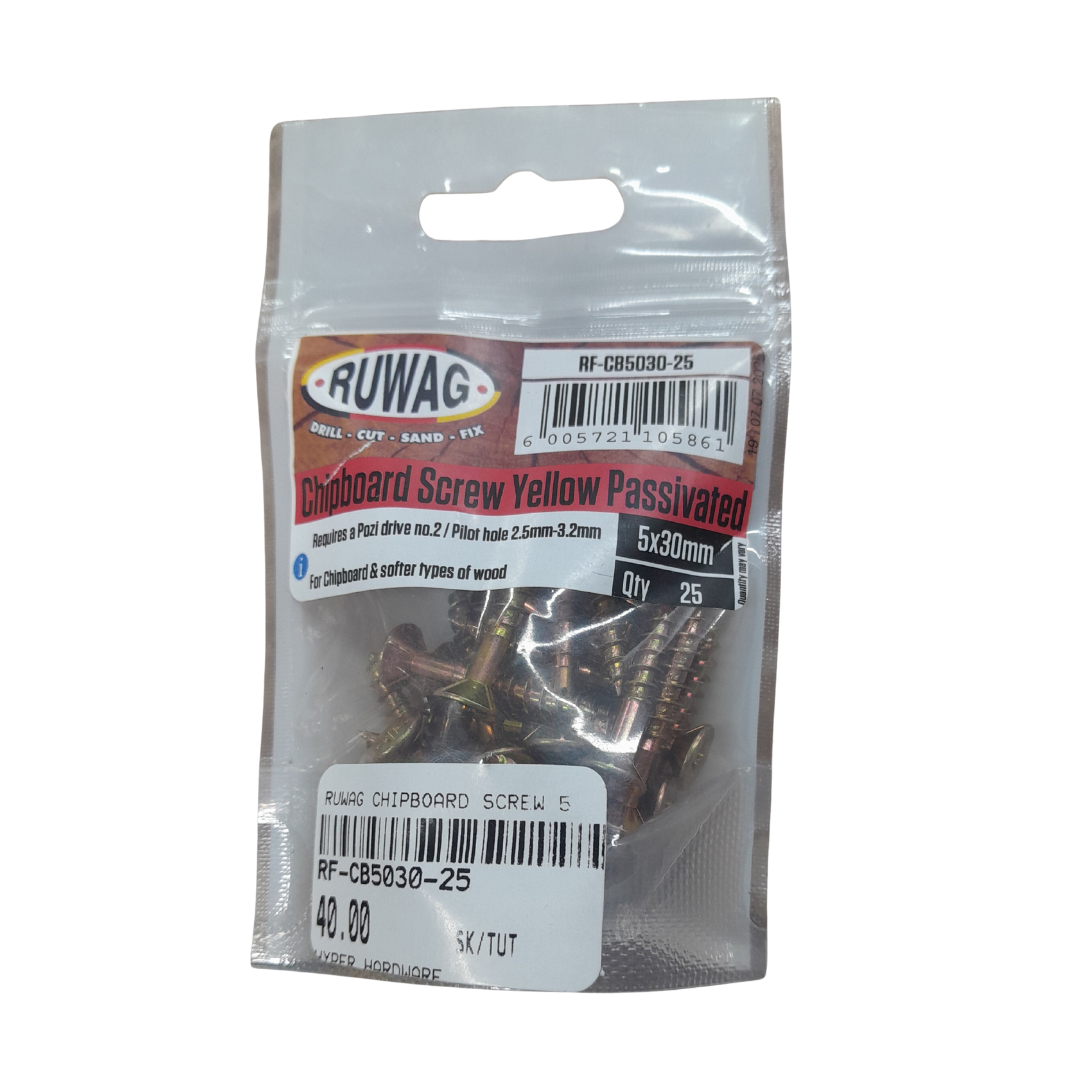 Ruwag Chipboard Screws are used for joining wood. You can use them with wall plugs for the fastening of light shelves and cupboards.